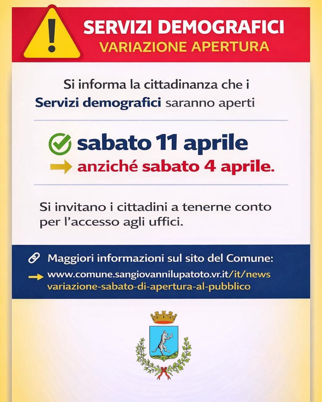 Pertanto, gli uffici saranno aperti in via straordinaria sabato 11 aprile.