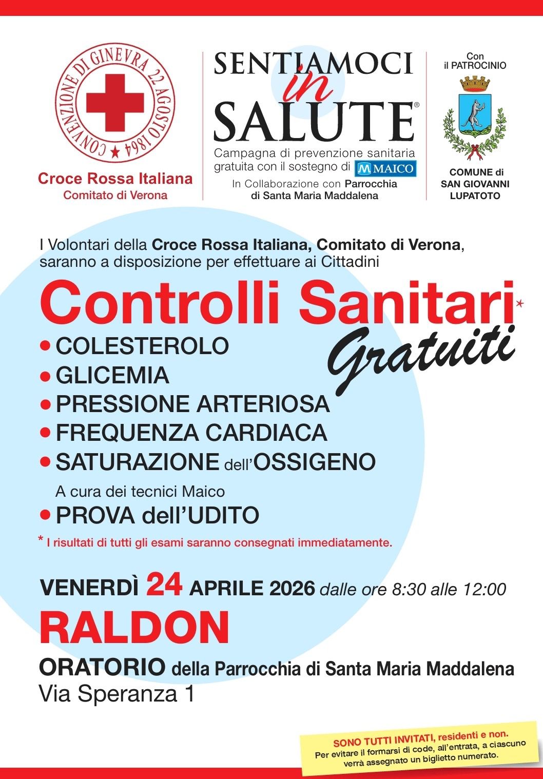 San Giovanni Lupatoto, 19 marzo 2026 - Il Comune di San Giovanni Lupatoto concede il proprio patrocinio alla campagna di prevenzione sanitaria “Sentiamoci in Salute”, organizzata dalla Croce Rossa Italiana – Comitato di Verona, in programma venerdì 24 aprile 2026 presso il Centro Comunitario di Raldon.