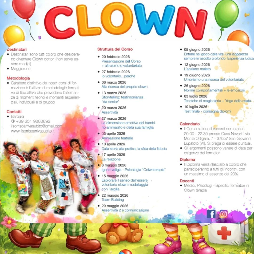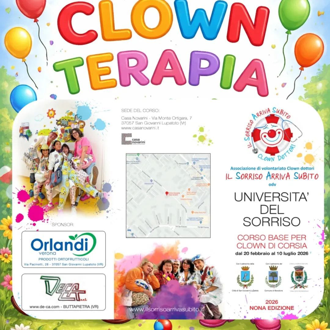 Il Corso, giunto alla nona edizione, si svolgerà dal 20 febbraio al 10 luglio 2026 presso Casa Novarini, a San Giovanni Lupatoto, e ha l’obiettivo di formare nuovi volontari clown-dottori destinati a operare in ospedali, strutture socio-sanitarie e contesti di fragilità, affiancando il personale sanitario ed educativo attraverso la clown-terapia.